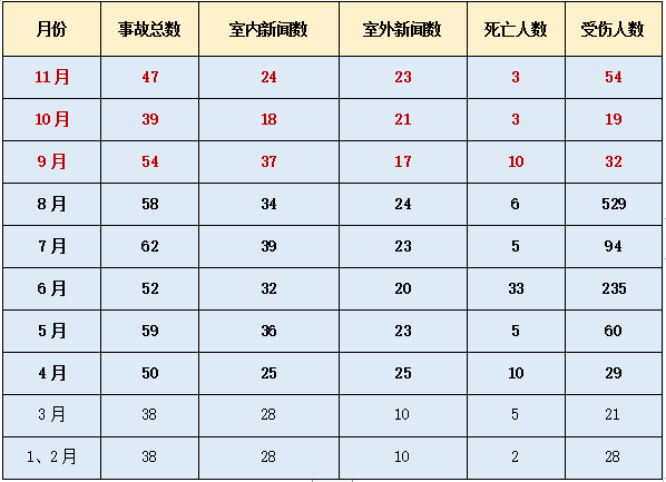 2020年11月份@燃气爆炸共收集室内燃气爆炸事故新闻24起,占总数51.1%;较10月份增加6起,共造成3人死亡,53人受伤。
